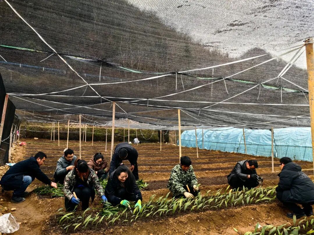 清晨,远处的山峦若隐若现,而营竹村这片土地早已热闹起来。村干部、驻村干部手持锄头,熟练地翻动土地,一条条整齐的垄沟在阳光下泛着光泽。紧接着,他们从一旁的遮阳棚下取出一筐筐精心挑选的杜鹃兰种苗,小心翼翼地将种苗放入事先挖好的小坑中,轻轻压实周围的泥土,确保种苗能够稳固扎根。