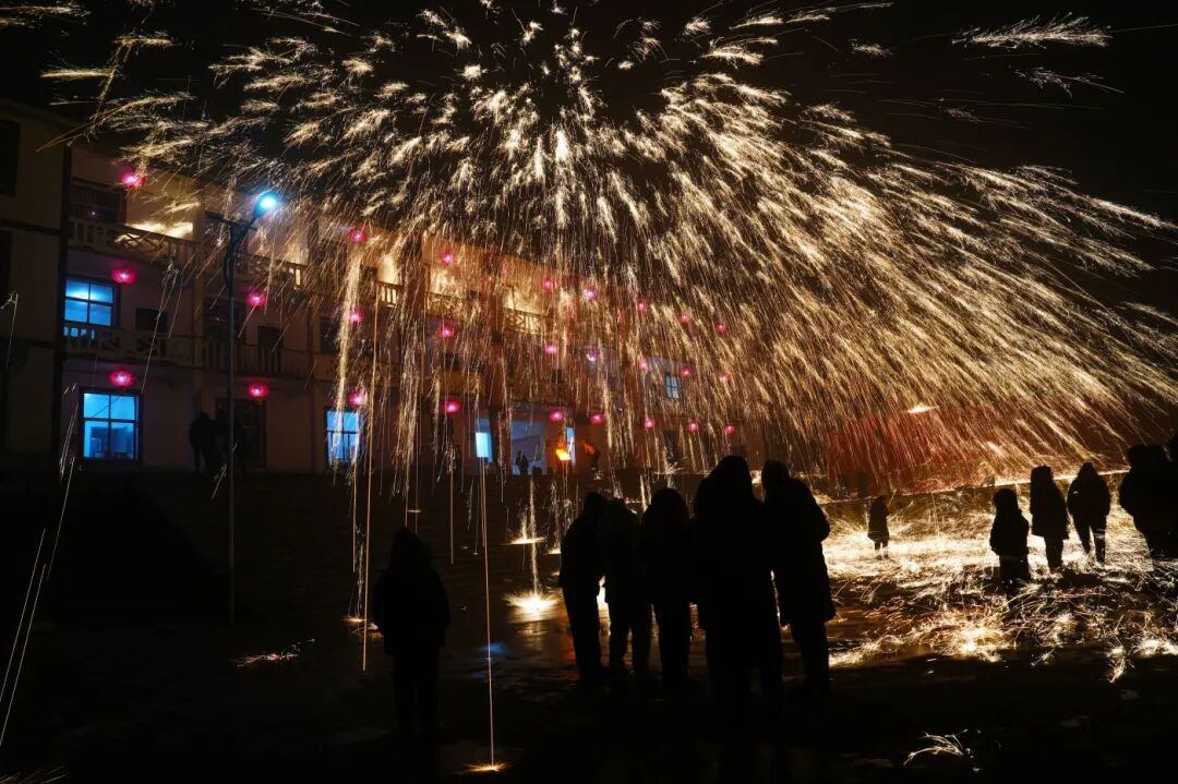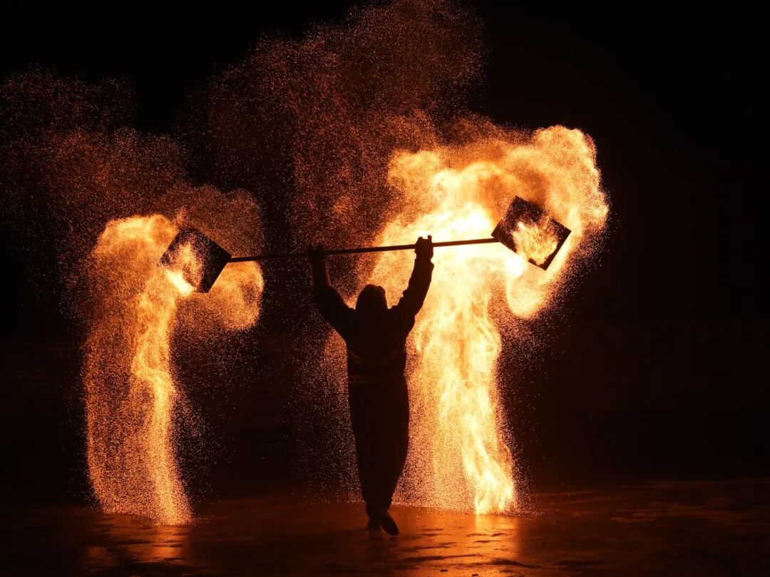 夜幕降临,打铁花、火壶表演惊艳登场。民间艺人将高温融化的铁汁击向天空,铁汁瞬间迸裂开来,如天女散花般洒落,美不胜收;滚烫的铁汁装好,放在旋转仪器上,随着仪器开启,铁花飞洒,在空中形成巨大的旋转图案;艺人手持火壶,碎炭、起火、抖壶......动作流畅而富有节奏,周围火星四溅,引得现场群众惊叹连连,掌声、喝彩声不断。