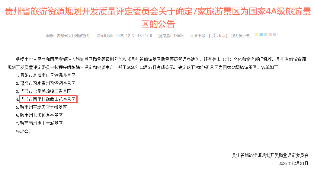 近日,经贵州省旅游资源规划开发质量评定委员会组织评定并完成公示,百里杜鹃管理区彝山花谷景区被正式确定为国家4A级旅游景区。这不仅标志着彝山花谷在景区服务质量、环境品质、景观价值与综合管理水平上迈入了国家级旅游精品序列,更意味着百里杜鹃再添一枚徽章。