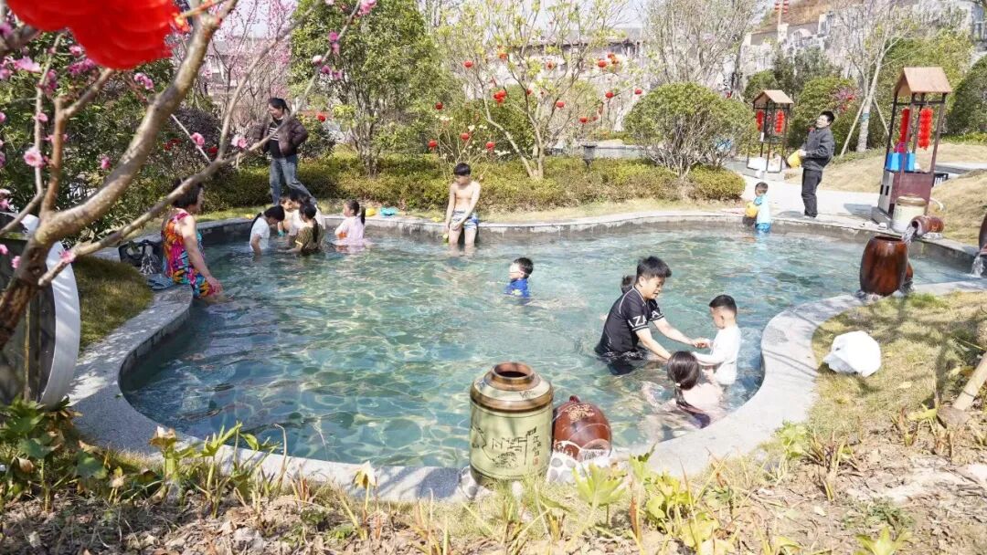 走进四季花海康养运动中心,阳光照耀下的温泉水波光粼粼,周围的鲜花和灯笼将环境装扮得格外喜庆,体验温泉的游客分散在各个泡池里,孩童戏水欢笑,大人静泡闲谈,享受温馨祥和的节日氛围。